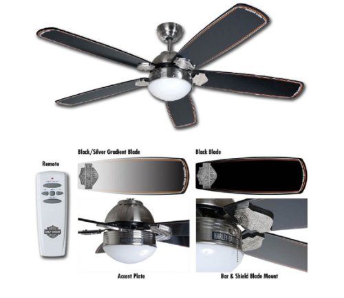 Feel the breeze in your face - even when you aren't riding! 52" H-D® Remote Control Ceiling Fan with brushed nickel housing transforms any room with its sleek H-D styling and custom accents. Remote control operated fan speed and light lets you shift gears with ease. Reversible H-D pinstriped bladesHarley-Davidson® Ceiling Fan. HDL-17105 Do not Miss!! Feel the breeze in your face - even when you aren't riding! 52" H-D® Remote Control Ceiling Fan with brushed nickel housing transforms any room with its sleek H-D styling and custom accents. Remote control operated fan speed and light lets you shift gears with ease. Reversible H-D pinstriped blades... Harley-Davidson® Ceiling Fan. HDL-17105